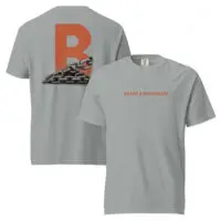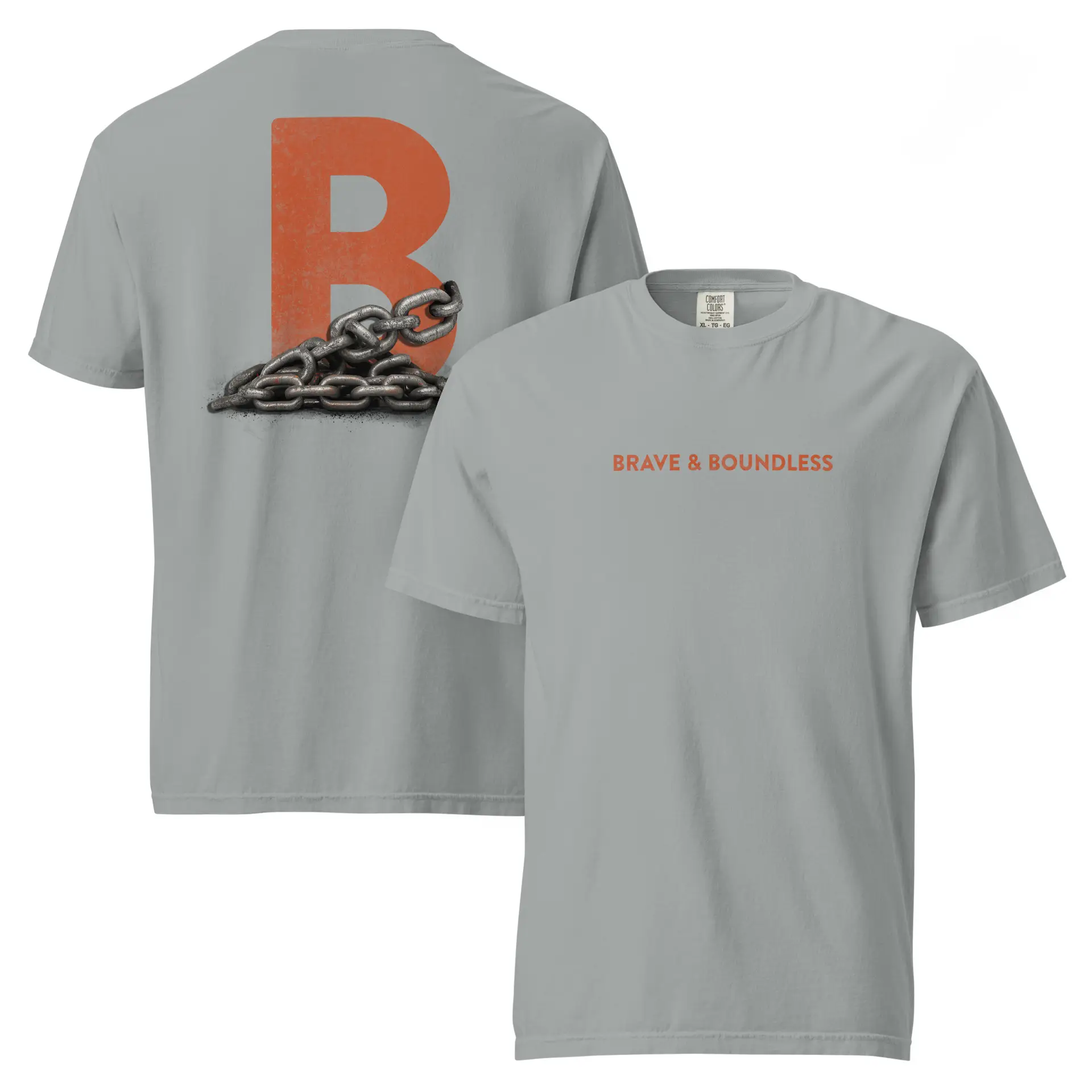 This is the boldest piece in The Forge — big orange letterform, broken chain running through it, Brave & Boundless across the front chest in classic B&B orange. If the script tee is for when you’re moving quietly, this one is for when you’re done being quiet.